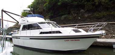Based on the same hull as the 35 European, this boat has an entirely different deck and superstructure. Two versions were made, both with an aft cockpit; one a single level cruiser, and the other having a flying bridge, which was enlarged on later models. Although these are both popularly known as the 35 Sedan, it is now thought that the Sedan label originated with the single level model, and the flybridge version should properly be referred to as such.